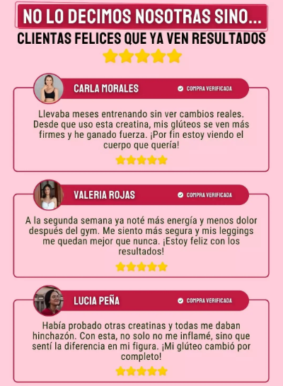 Mujeres como tú ya están notando la diferencia: más energía, mejor rendimiento y cambios visibles en su figura. El 93% afirma sentirse con más fuerza, el 90% reporta entrenamientos más efectivos y el 97% recomienda el producto a sus amigas.